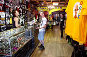 "We realized when designing the new spot that a lot of what we sell is black," says Stefanie. So they went toward the obvious green skulls and pink and yellow wigs and other off-primary tones wherever they could. "We tried to give everyone a lot of eye candy," says Rob, who along with his missus, is the spikiest, most colorful part of the decor.